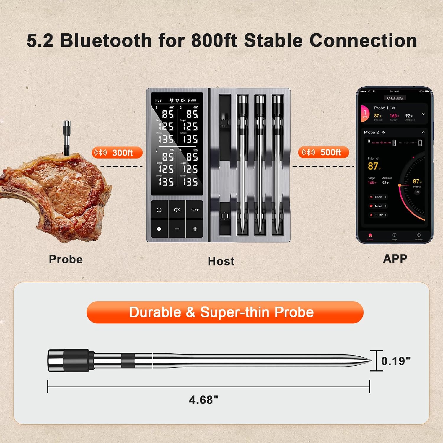 - 800FT BLUETOOTH REMOTE MONITORING - With 5.2 Bluetooth and 800ft long range stable connection, this kitchen thermometer monitors your cooking from anywhere, no signal drops even through walls. Convenient for indoor and outdoor backyard BBQs, keeps precise control
