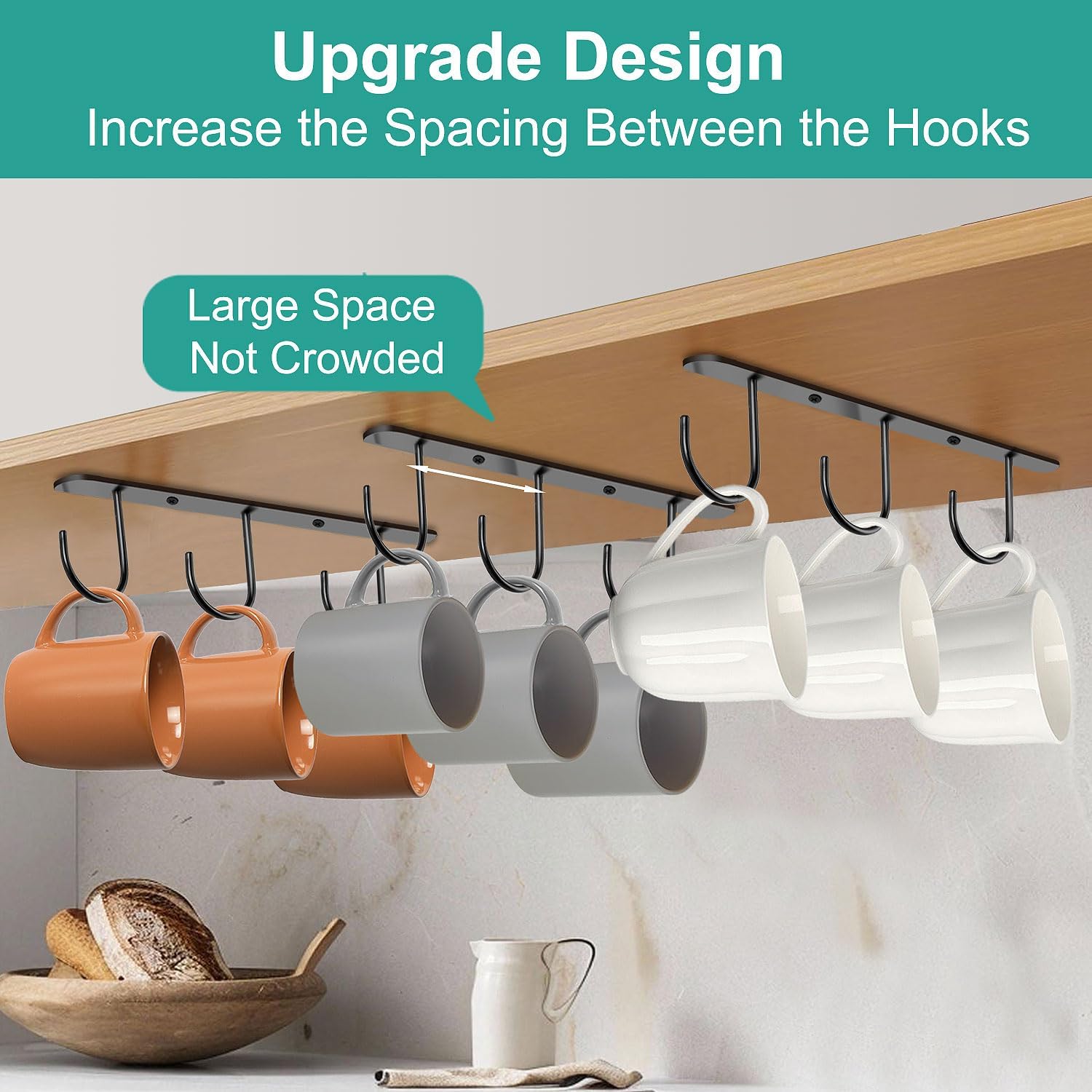 - 【Upgrade Design】The coffee mug holder under cabinet have been upgraded to increase the spacing between the hooks. Now the spacing between hooks is enough large to prevent crowding between cups.