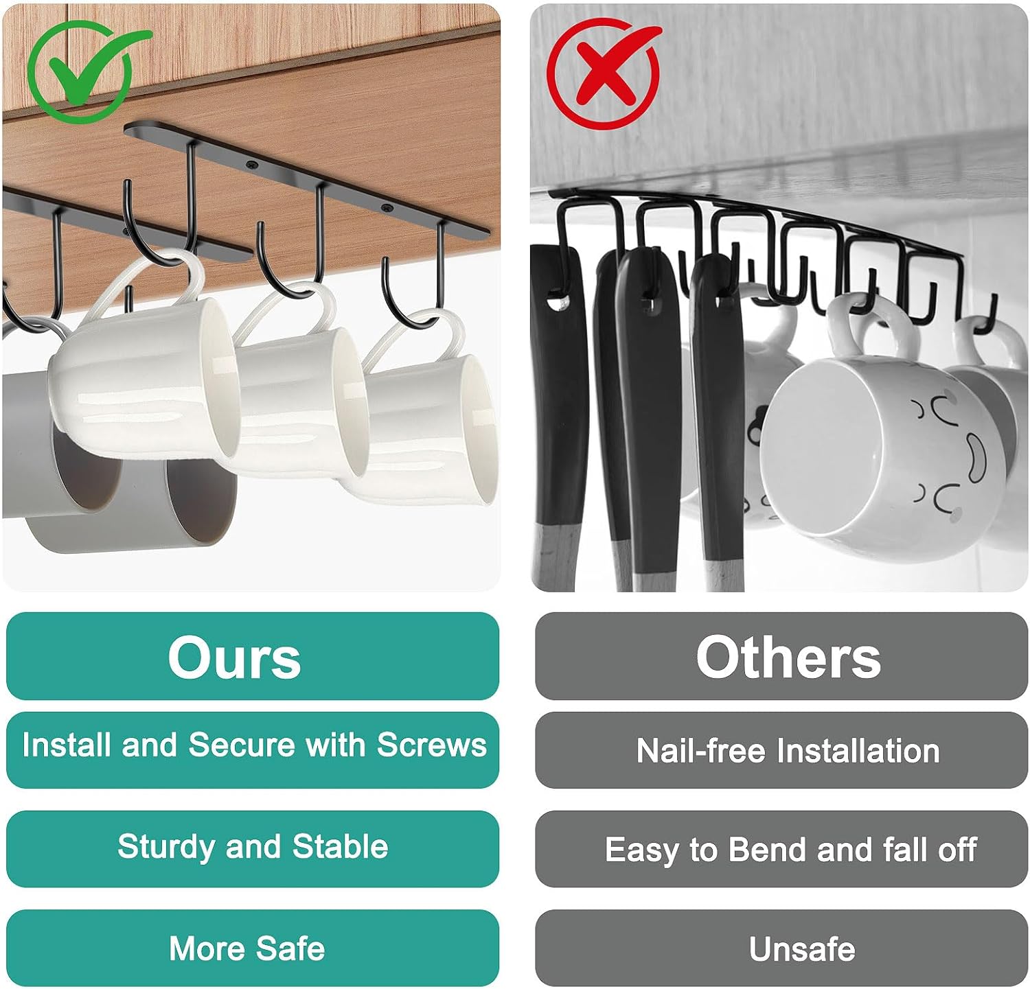 - 【Easy Installation】The coffee cup holder can be easily installed with the included screws, and fixing the coffee cup organizer for cabinet with screws is safer and more reliable, so you don't have to worry about them deforming or falling off and breaking your cup.