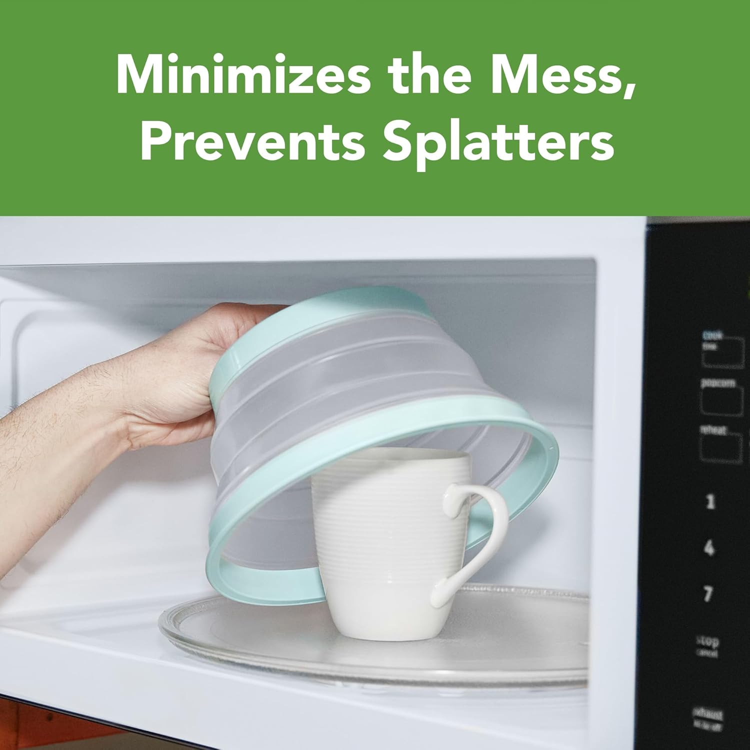 - Collapsible for Easy Storage: This collapsible cover pops up to 3" to cover tall dishes, piles of food, and shallow bowls. The cover collapses to 0.75" for easy storage. Cover can also be used flat to cover large bowls to prevent splattering.