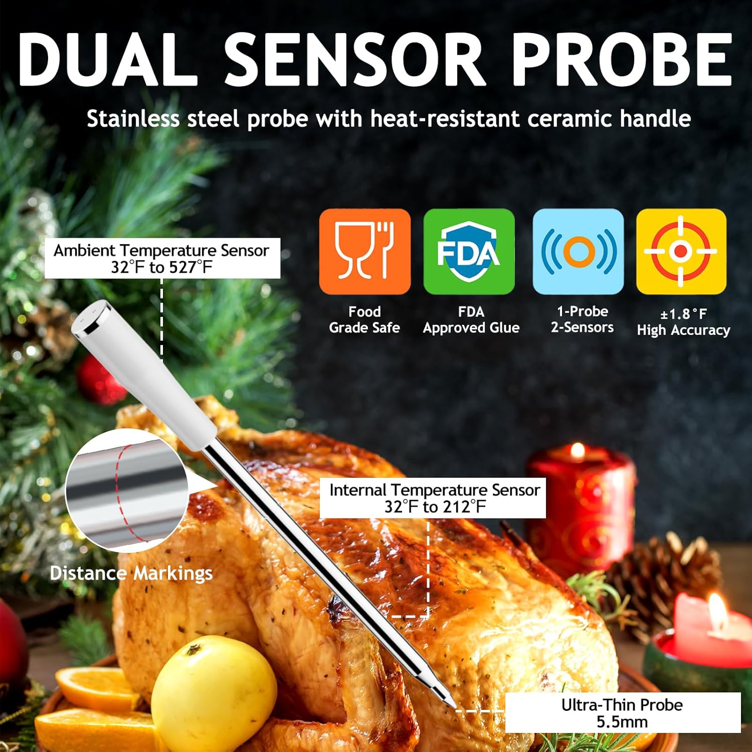 - 🔗 100% Wire-Free Meat Thermometer Probe with Safe Needle: No wires to get tangled or limit your cooking. Our food thermometer features a fully wireless probe with food-grade and 5.5mm ultra-thin stainless steel needle—easy to insert.
