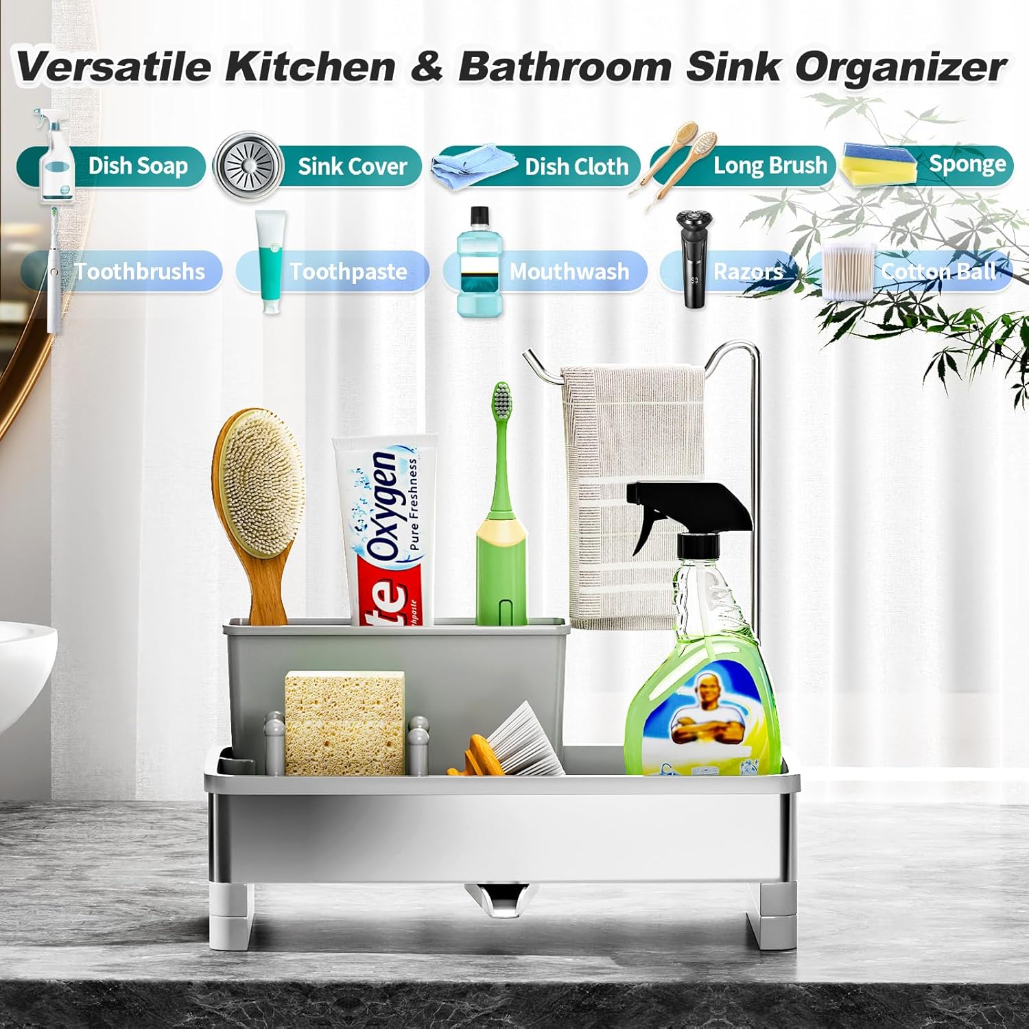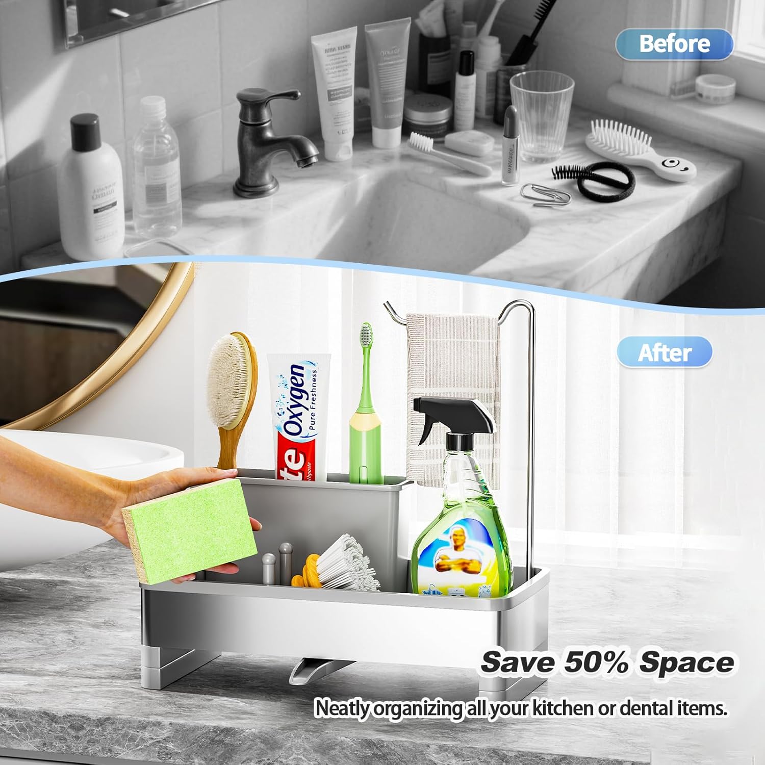 - ăRemovable Brush Holder & Dish Cloth HangerăIt not only serves as a sink sponge holder, but also comes with a removable brush holder that can accommodate brushes of different sizes. It also features a towel rack that allows your dish towels to hang and dry easily. Our sink caddy allows you to organize and store kitchen cleaning supplies more efficiently, saving space in your kitchen.