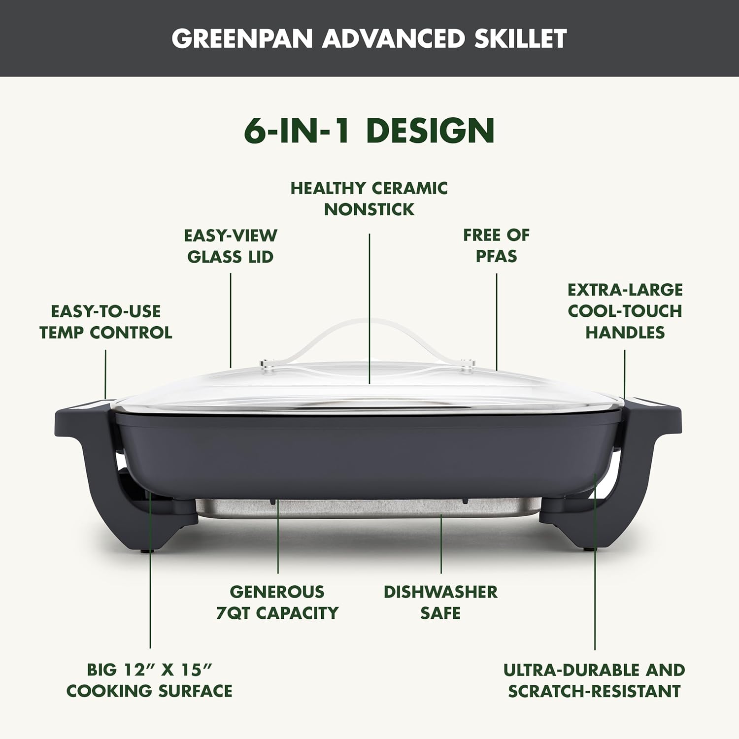 GreenPan Advanced 12” X 15” Electric Skillet with Lid, 7QT Capacity for Family Meals, Healthy Ceramic Nonstick PFAS-Free Coating, Fry, Sauté, Steam, Simmer, Sear, Stir Fry, Dishwasher Safe, Graphite
