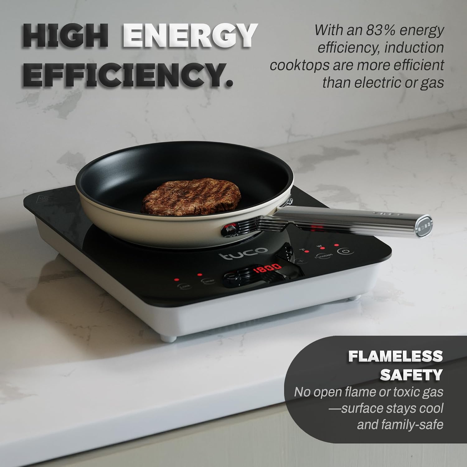 - β‘ FASTER HEATING & ENERGY SAVINGS: The TUCO Portable Induction Cooktop achieves up to 83% energy efficiency, outperforming gas and electric stoves. It heats cookware directly using electromagnetic fields, reducing heat loss and ensuring rapid heat-up with less energy waste.