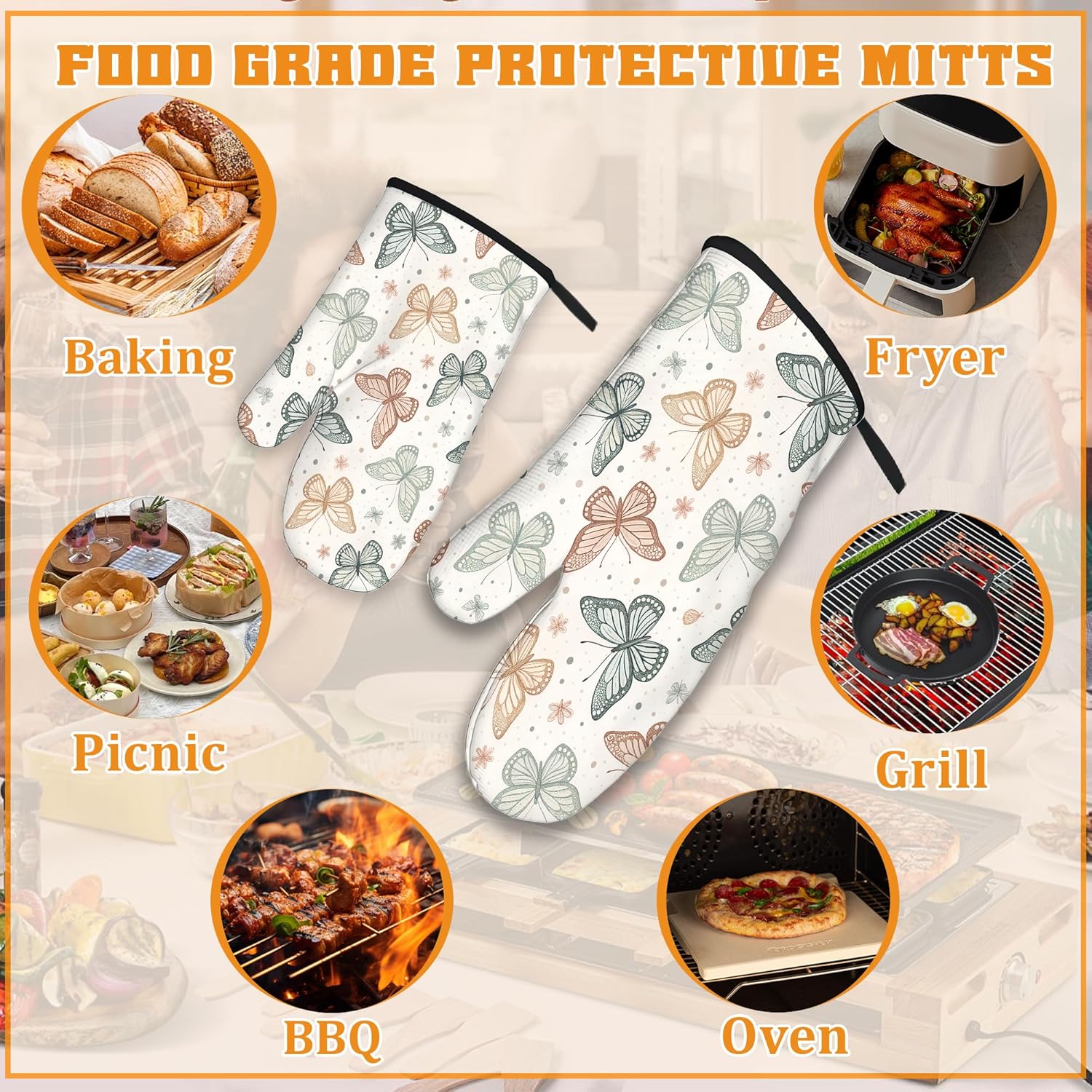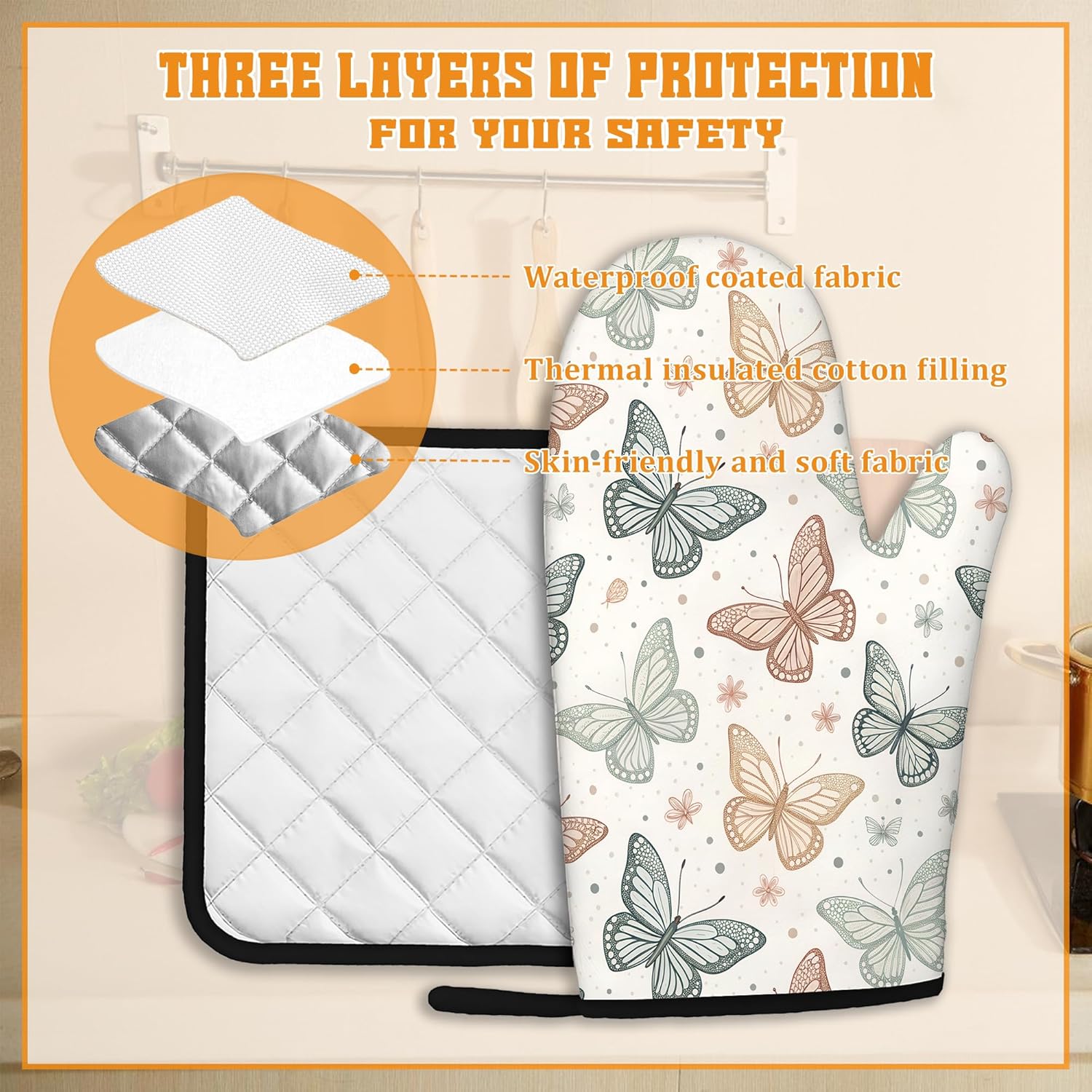 Butterfly Vintage Oven Mitts and Pot Holders Set,Boho Kitchen Decor Heat Resistant Non Slip Hot Pads and Oven Mitt for Chef Cooking Baking BBQ Mom Girl Gifts(4 Piece Set)