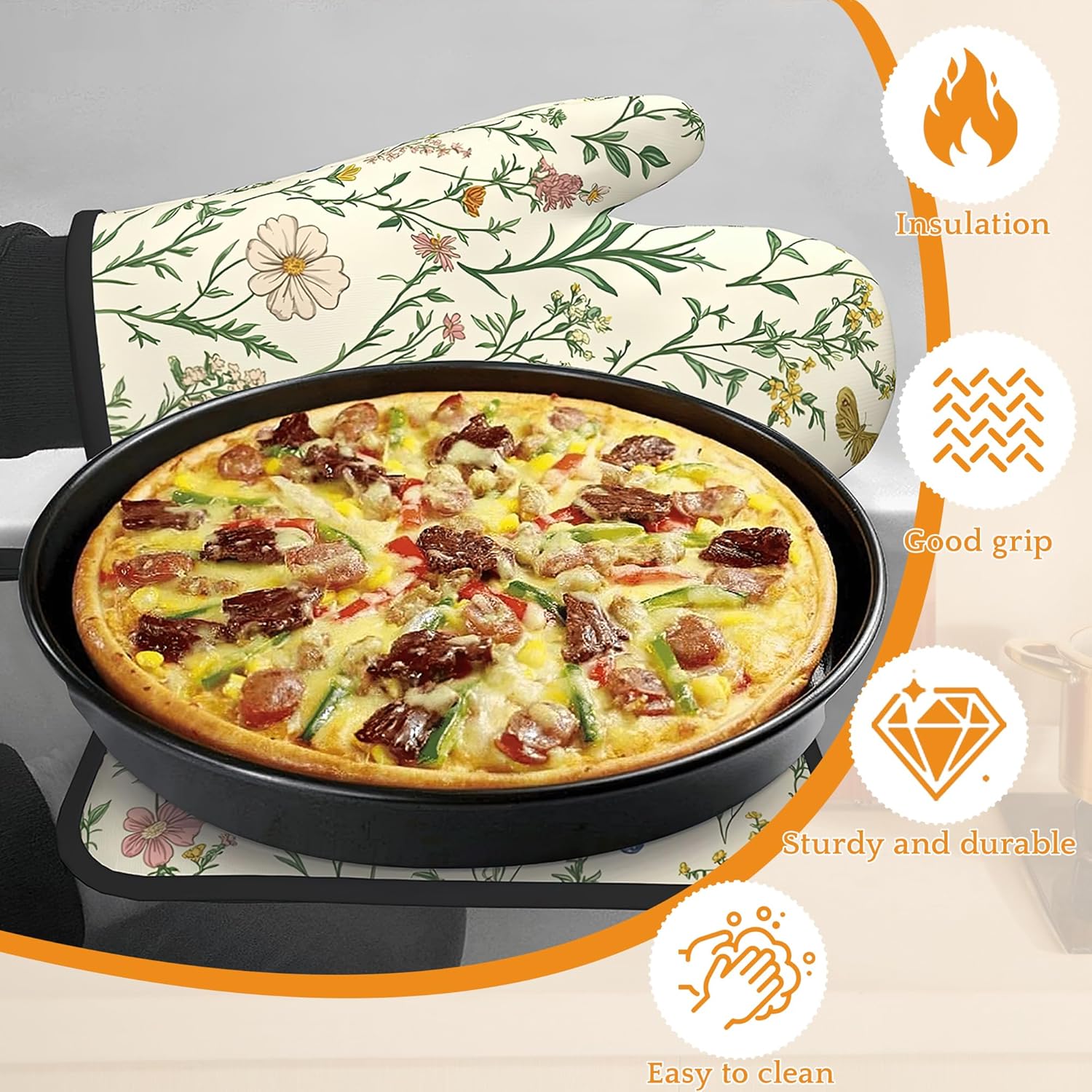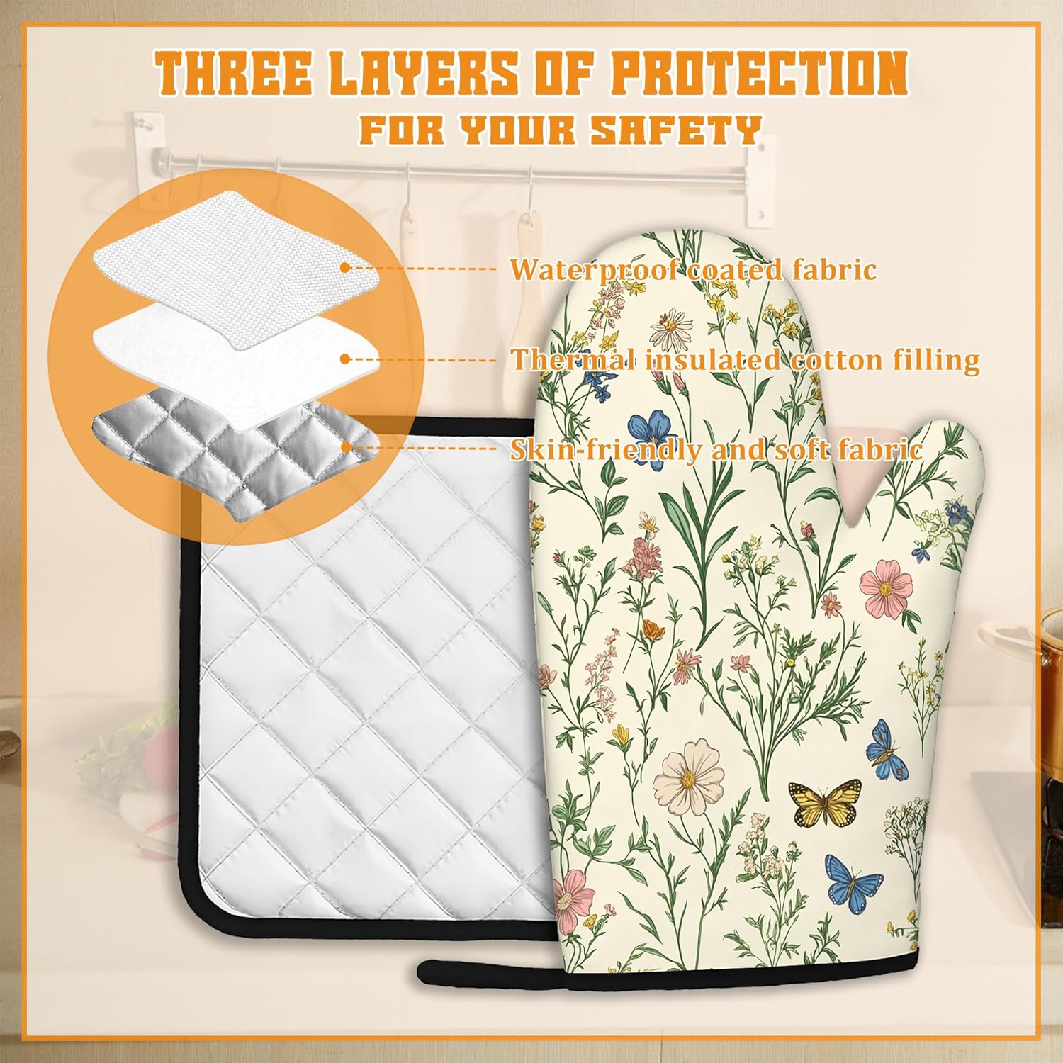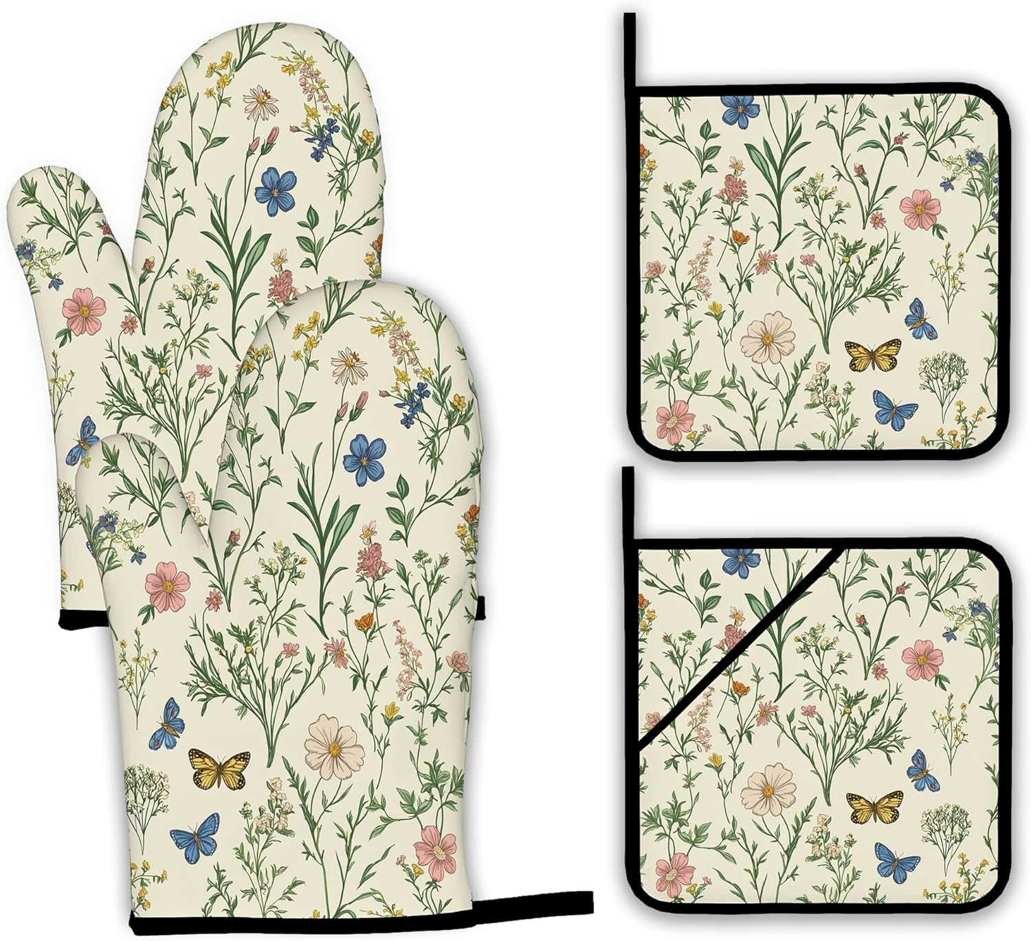 Wildflowers Oven Mitts and Pot Holders,Vintage Garden Plants Herb Flower Botanical Heat Resistant Oven Mitts Gloves and Pot Holder for Home Kitchen Decorations Cooking Baking BBQ Gifts,Set of 4