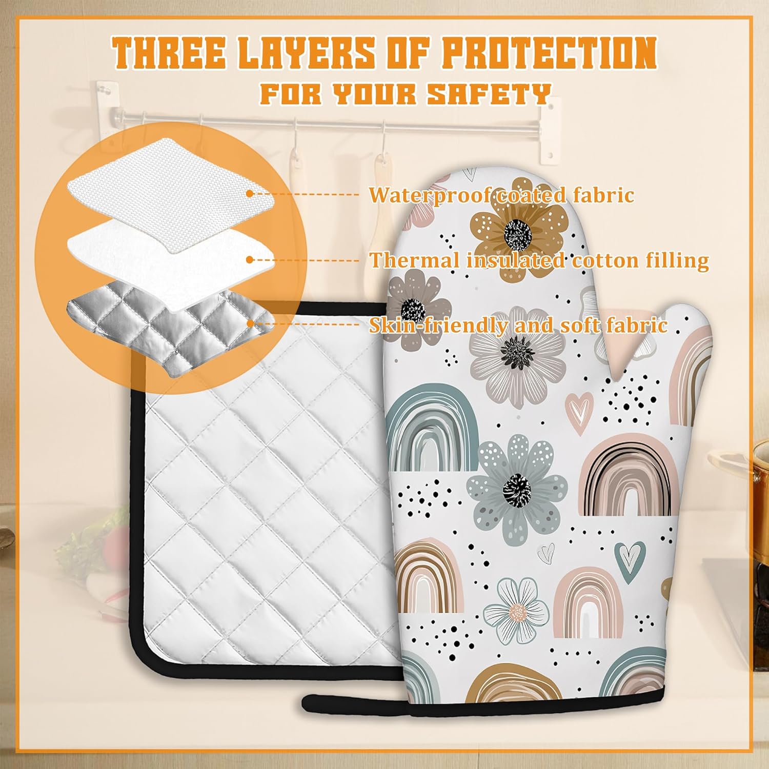 - Heat Resistant: Made from polyester and insulating cotton, these oven mitts and pot holders provide excellent heat resistance to effectively protect your hands from hot pots, pans, and baking trays. Cook with confidence and safety.