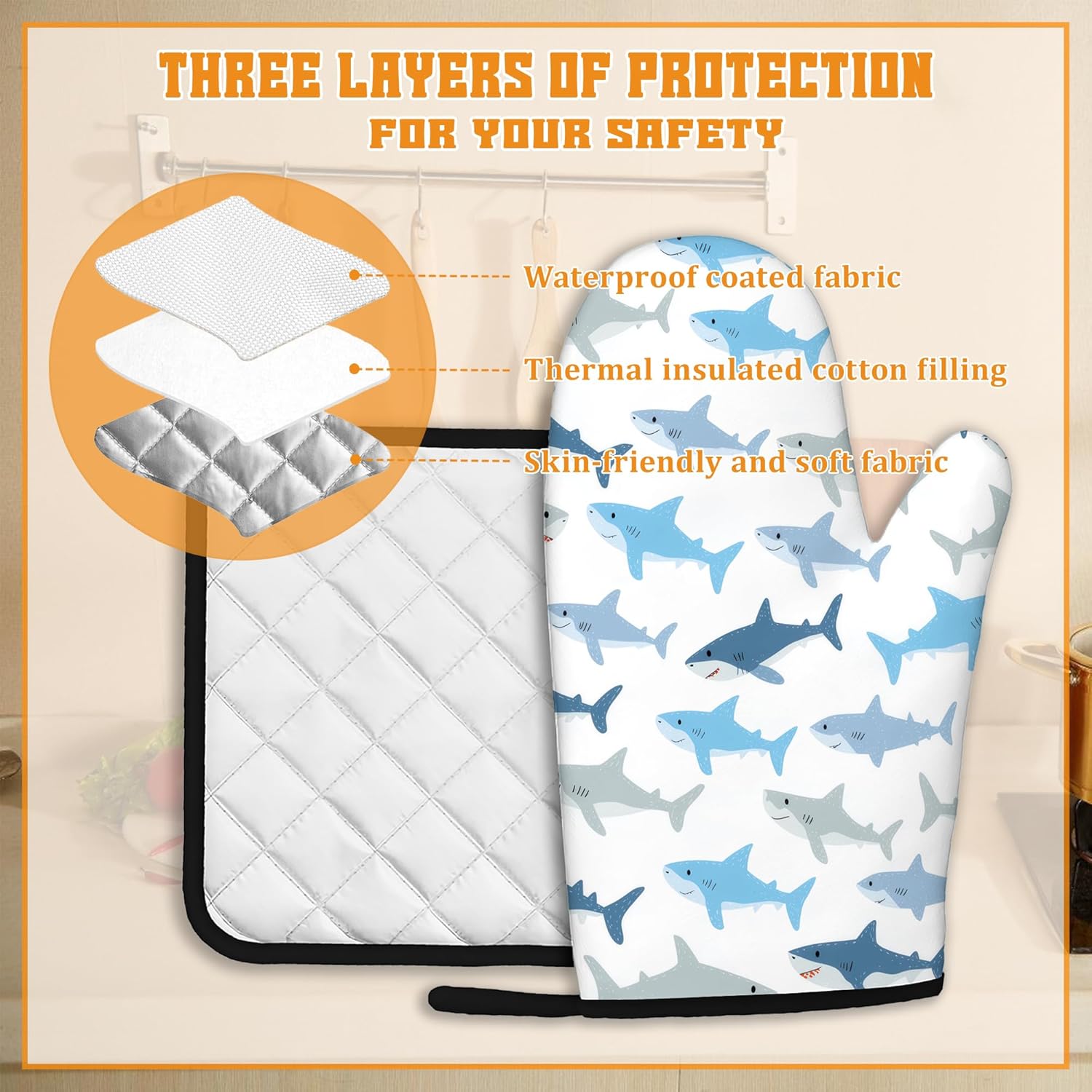 - Stylish Design:Cute Shark patterns bright colors,unique prints are exquisite decorations for your kitchen.Brightly colored designs will surely impress your guests and enhance the atmosphere of your kitchen,making your kitchen less monotonous and more lively.