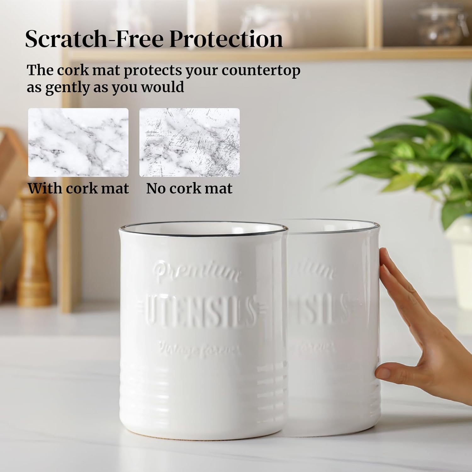 - Countertop Protection Cork Mat: Designed with a soft cork mat, this white ceramic utensil crock protects your countertops from everyday scratches and scuffs, blending practicality with a touch of rustic warmth