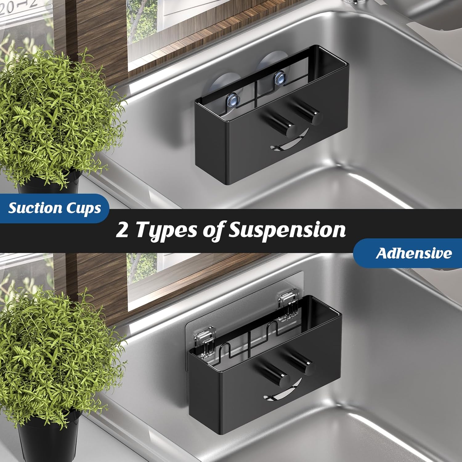 - 2 DIFFERENT INSTALLATION METHODS: The kitchen sink suction holder offer 2 installation methods(suction cups or adhesive hooks).The suction cups can be readily changed to a different mounting position and are suitable for smooth surfaces.Sticky adhesive is more stable (if you need to remove the adhesive, just heat it with a hot hair dryer)