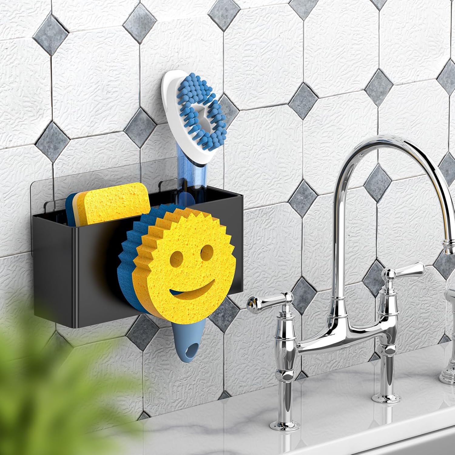 - DISTINCT APPEARANCE DESIGN: We have improved over the old version of this sink caddy feature.Not only can this sink sponge holder store a smiley face sponge,but it also holds a scrubber/dish brush/sink stopper