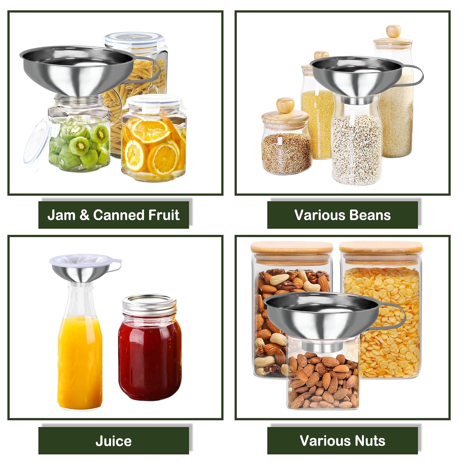 - Wide Use - The kitchen funnels set can transfer canned edible oil, jam,juice, essential oil, beans, salt, and fill Mason Jars,narrow jars, bottles, flask, canning, kombucha, water bottle, pepper and other dry Ingredients and powder.