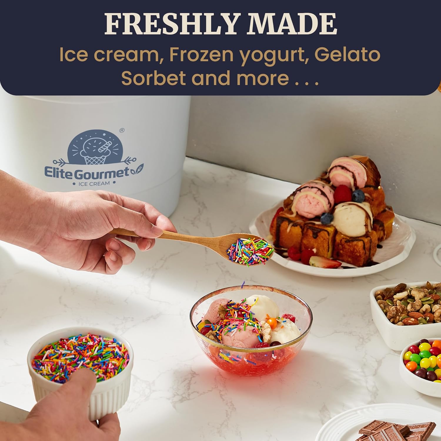 - EFFORTLESS ENJOYMENT: Using the Elite Gourmet Ice Maker is a breeze. Simply place prepared ice cream mix into the aluminum freezing cannister and place into the ice bucket, install the electric motor, then add ice & salt, plug in & turn On. Perfect, fluffy ice cream and other delicious treats will be ready to serve in no time! Add your favorite condiments and indulge in a cold, fresh & frosty treat!
