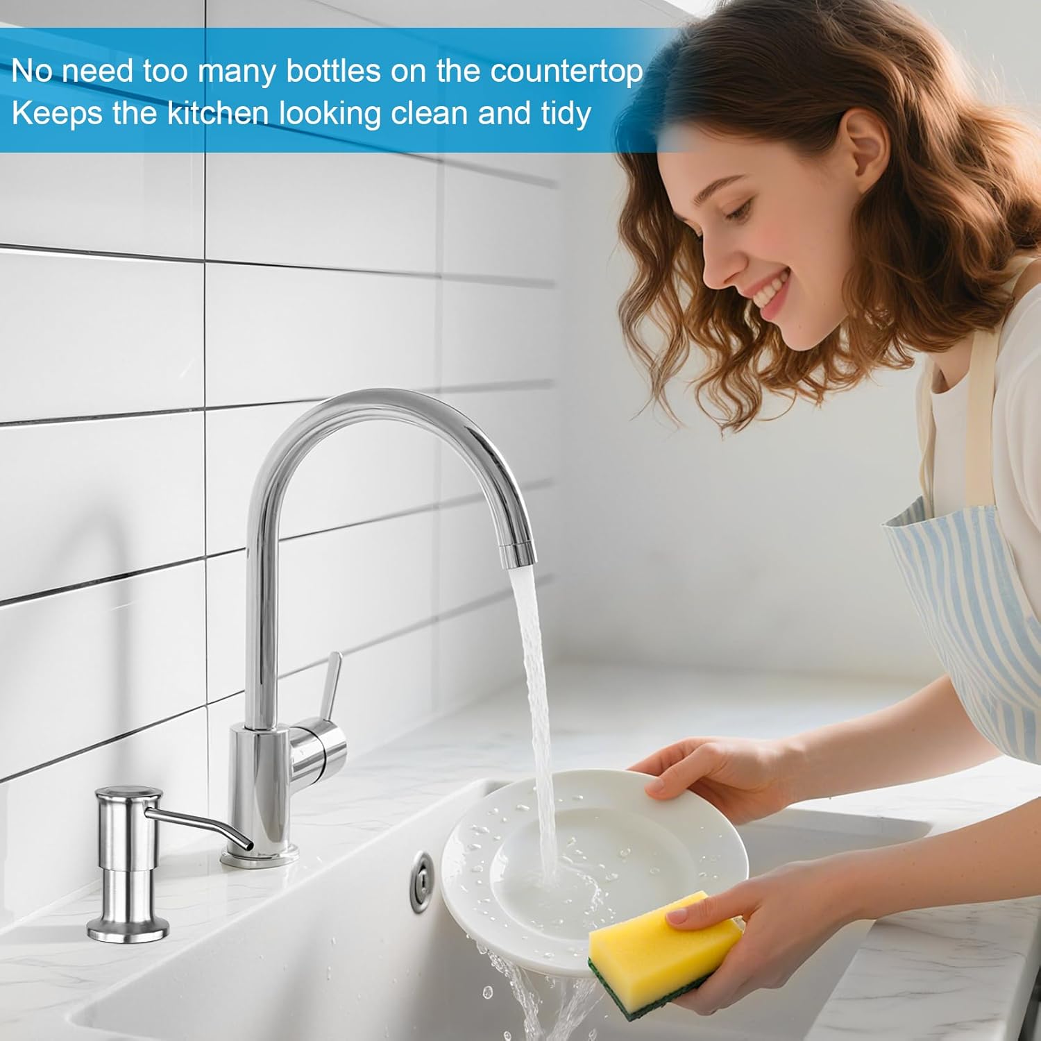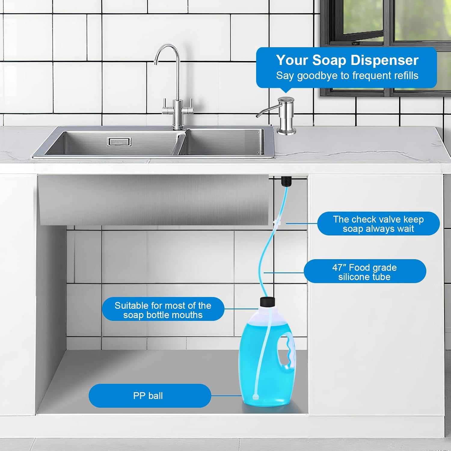 - No Filling Frequently: No more crawling under the sink. Our Soap Dispenser for Kitchen Sink comes with a 47β tube that plugs directly into a large dish soap bottle, saying goodbye to frequent refills.