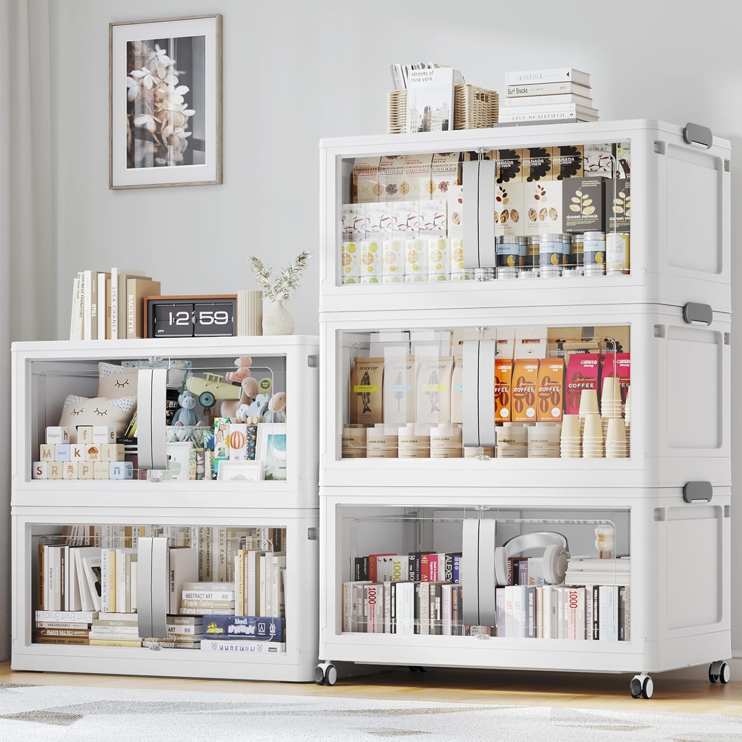 - 【Super Clear Doors & Ease Access】Stackable storage bins with doors open front features super clear PET doors for instant content viewing at a glance. Enjoy effortless one-handed access with the oversized ergonomic handle and secure magnetic closure. Sleek and modern folding storage bins with lids seamlessly complements any contemporary home decor