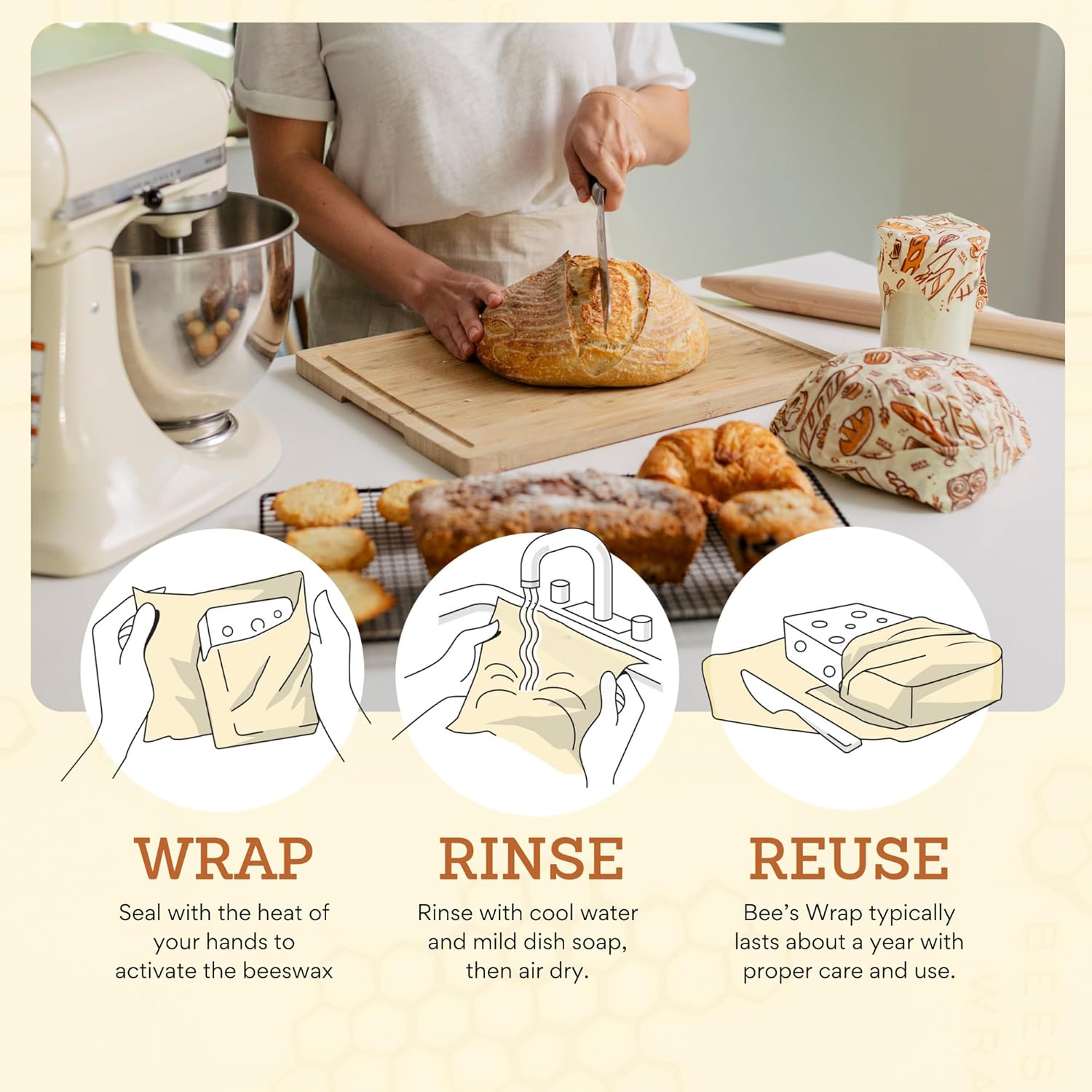 - BEESWAX WRAPS FOR FOOD in a large 14" x 52" wax paper roll featuring a fun bakery pattern with bread, rolls, bagels, flour and more. Made in USA reusable beeswax food wraps are a great alternative to single use plastic wrap, sandwich wraps, and aluminum foil.