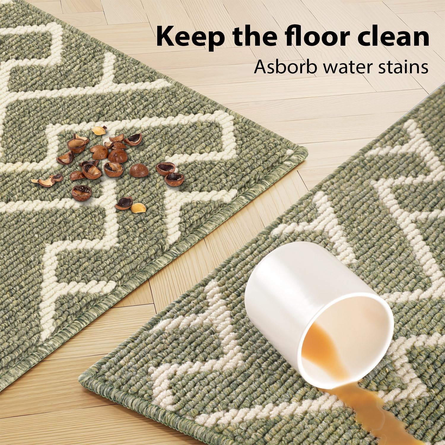 hicorfe Kitchen Rugs and Mats Sets,Non-Slip 2 Pieces Absorbent 100% Polypropylene Rug,Comfort Kitchen Runner Mat,Washable for Kitchen,Sink,Laundry(20" x 31.5" Plus 20" x 59",Green)