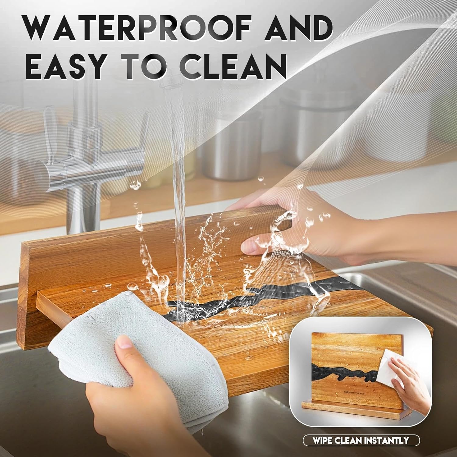 - [High-Quality Materials] Compact knife magnetic block: 14"L x 4.53"W x 10"H. Fits perfectly in any kitchen. Crafted by hand from carefully selected natural acacia wood and black resin. The acacia wood features a warm texture and excellent deformation resistance, scratch-resistant resin for a uniquely elegant look. Weighted thick base of knife holder ensures stability during use, preventing tipping. Wood magnetic knife holder offers both efficient knife storage and stylish countertop appeal