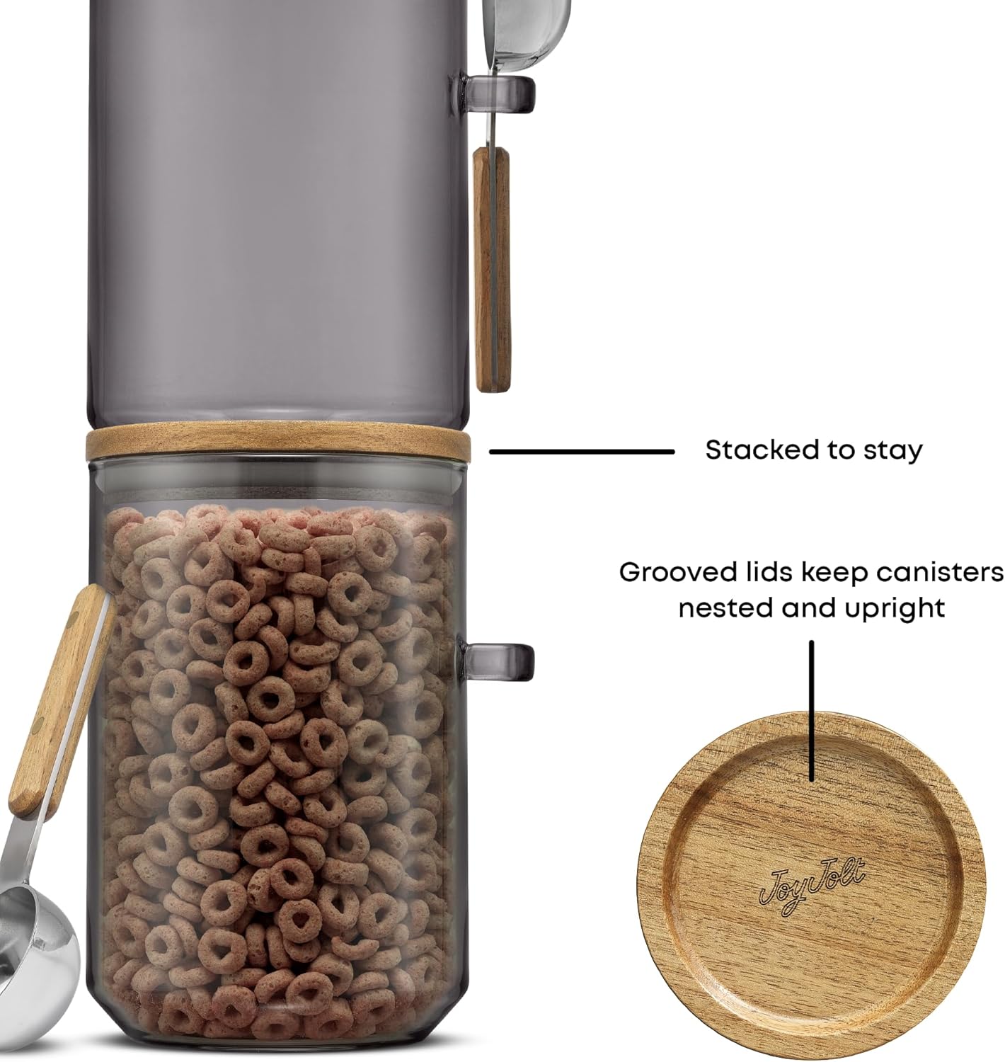 JoyJolt Holden 32oz Stackable Glass Storage Containers with Lids and Scoops, Airtight Food Canister Set of 3 w/Acacia Wood Lids, Round Stacking Pantry and Kitchen Containers w/Scoop | Smoke