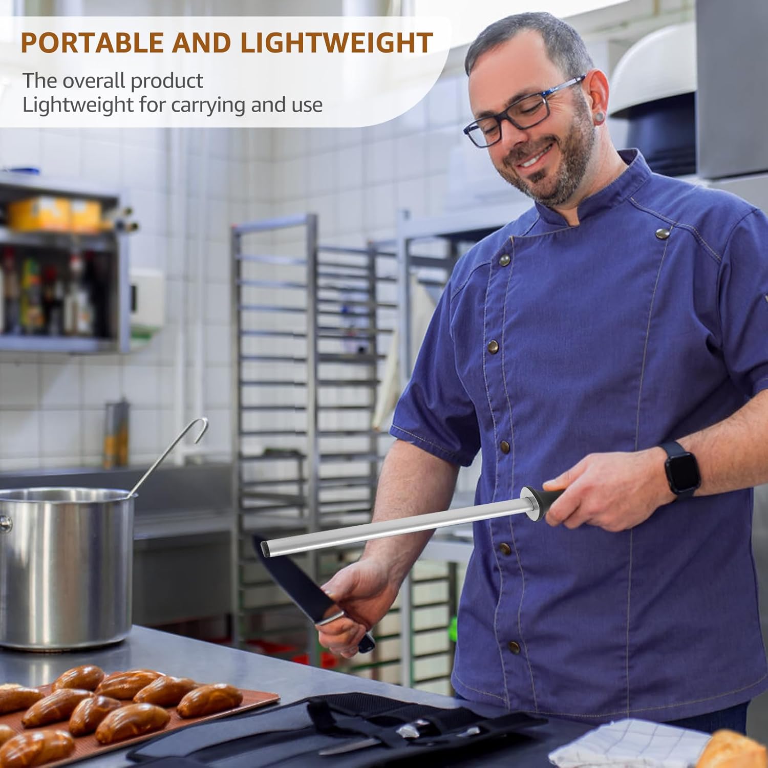 - Maintain your knife: While some sharpening rods claim to be 12 inches in length, it's important to note that this measurement may include the handle. However, our sharpening rods have a rod length of 12 inches, excluding the handle. With the handle included, the total length measures 16.93 inches. From small chef's knives to large butchering knives. The handle is easy to grasp and reduces the fatigue when we sharpen the knife.