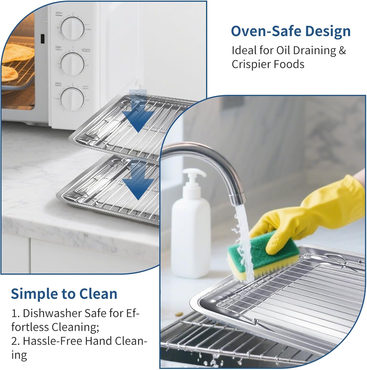 - 【Versatile Baking & Cooling】The racks work double duty: Place them on the pans while roasting to let fats drip away (say goodbye to greasy chicken!), then use them alone to cool pastries. Air circulates freely through the rack, cooling cookies in 10 minutes without sogginess. Saves half the storage space of separate tools!