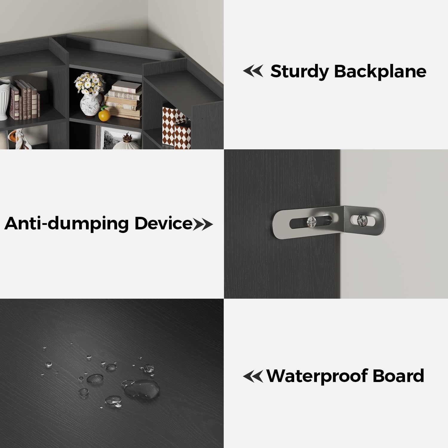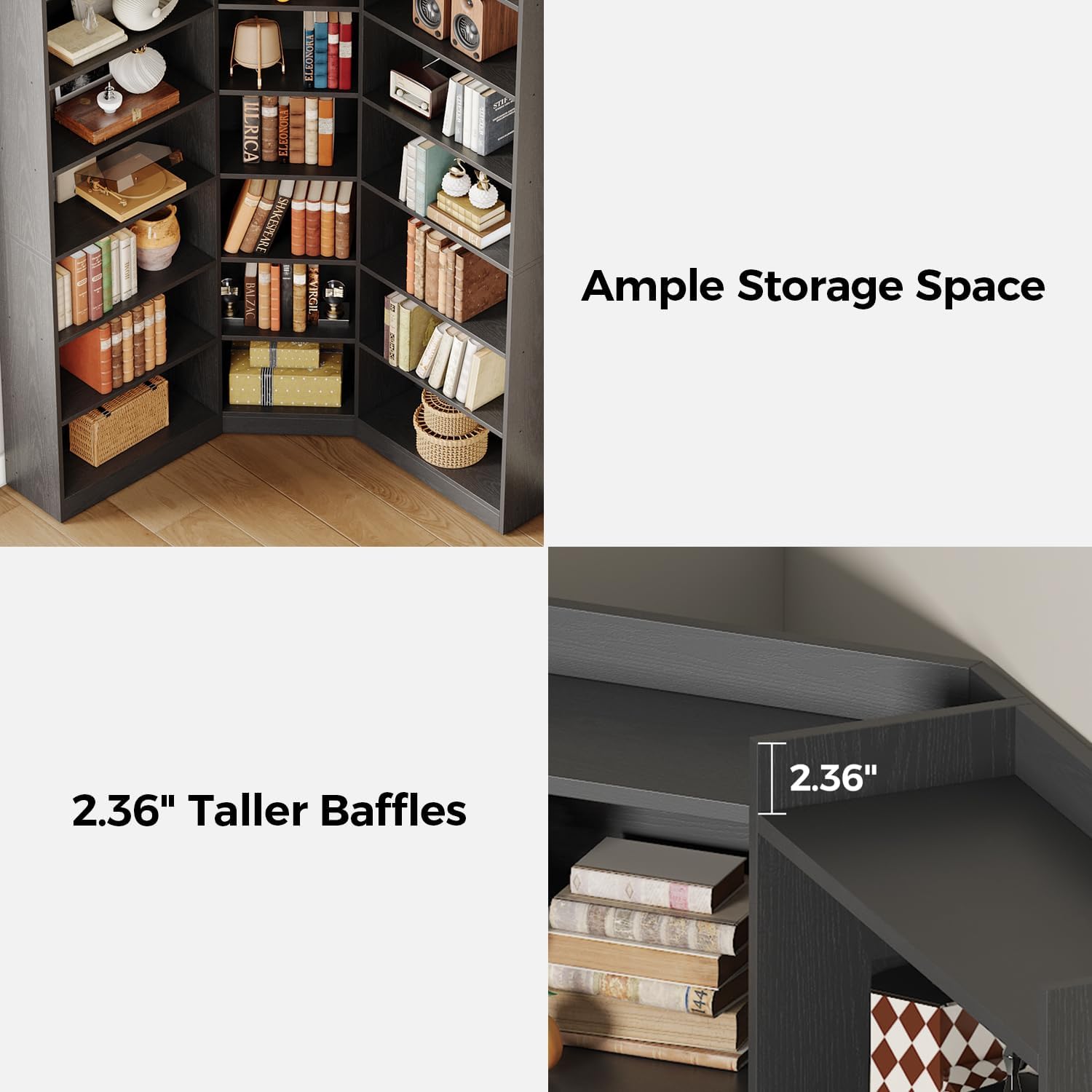 - Sturdy Construction: Crafted from high-quality medium-density fiberboard, this Corner bookshelf is designed for durability, ensuring it can withstand the weight of your belongings while featuring an anti-tipping mechanism for added safety. Each shelf can hold up to 80 lbs