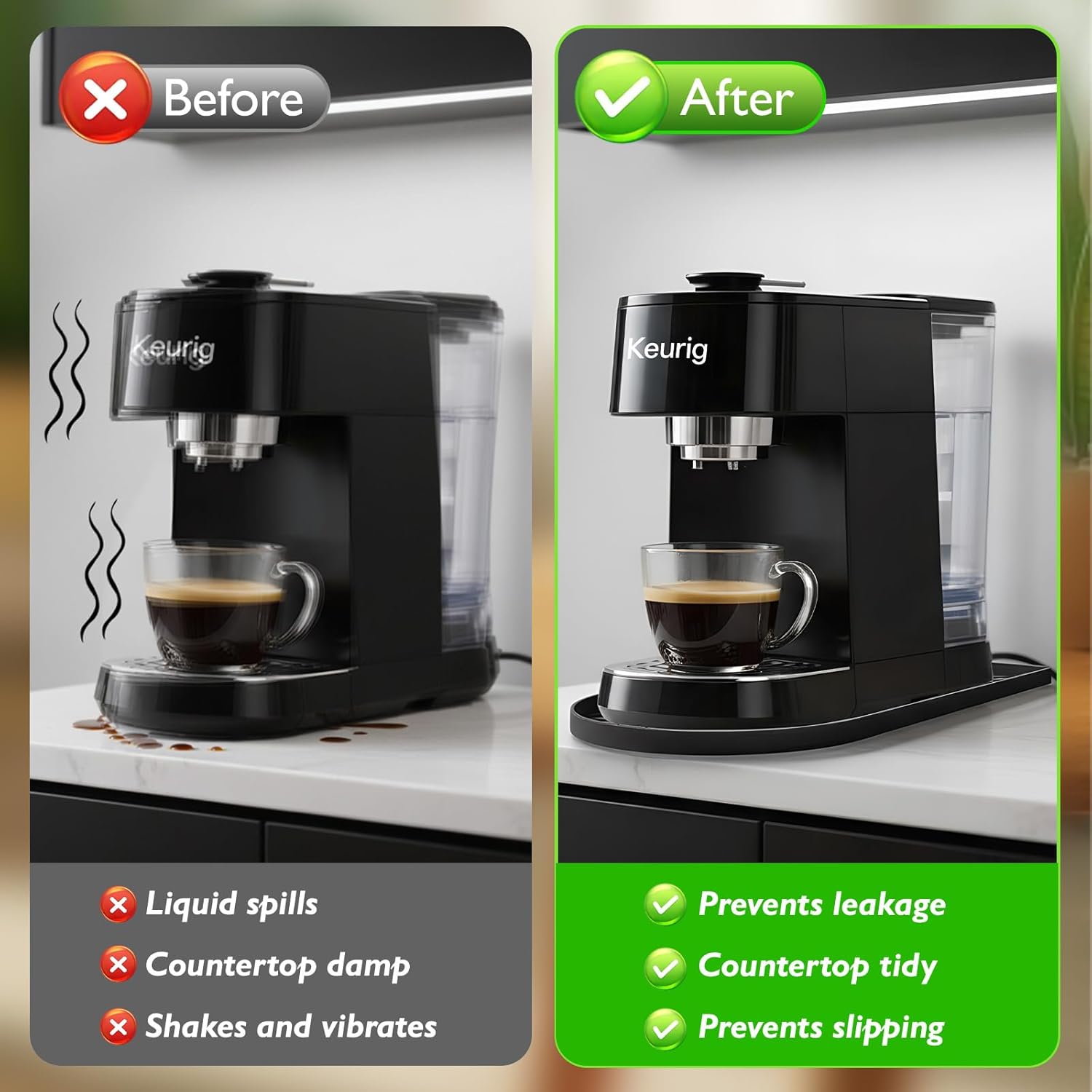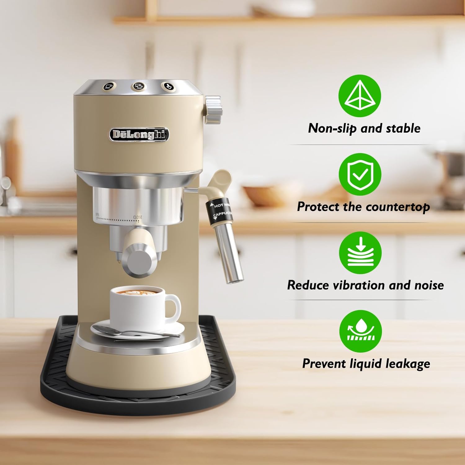 - Protect Counters & Appliances:Our coffee bar mat made of high-temperature resistant silicone (up to 446ยฐF/230ยฐC), it effectively absorbs heat from the coffee machine, avoiding thermal damage to wooden, marble, or quartz countertops. It also acts as a buffer against accidental spills, keeping both the counter and machine clean